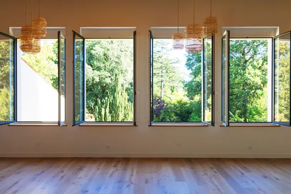 La salle principale, d’environ 90 m2, avec ses immenses fenêtres donnant sur la végétation, donne la sensation d’être à la fois à l’intérieur d’un chalet cosy, et à la fois à l’extérieur au milieu des arbres.