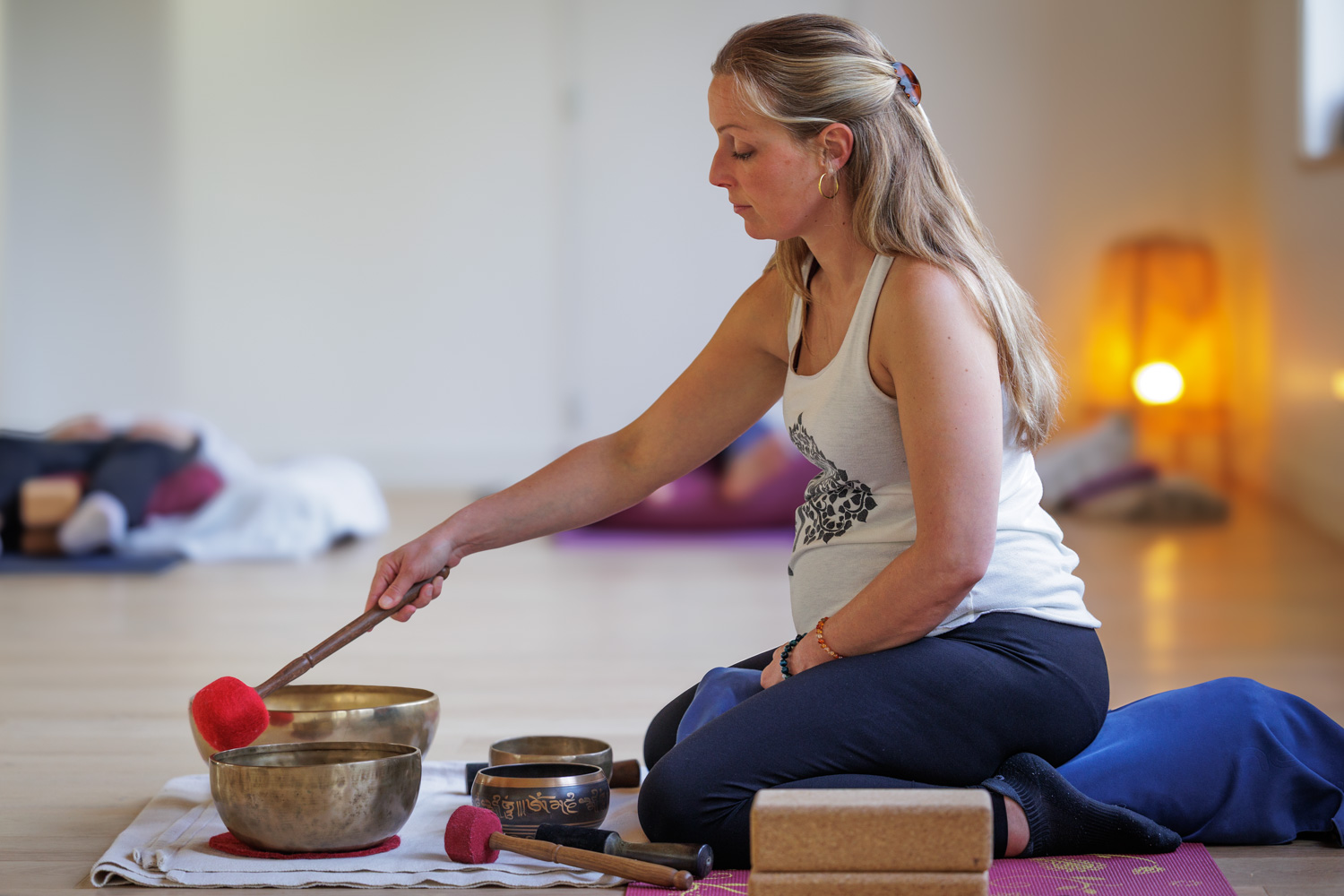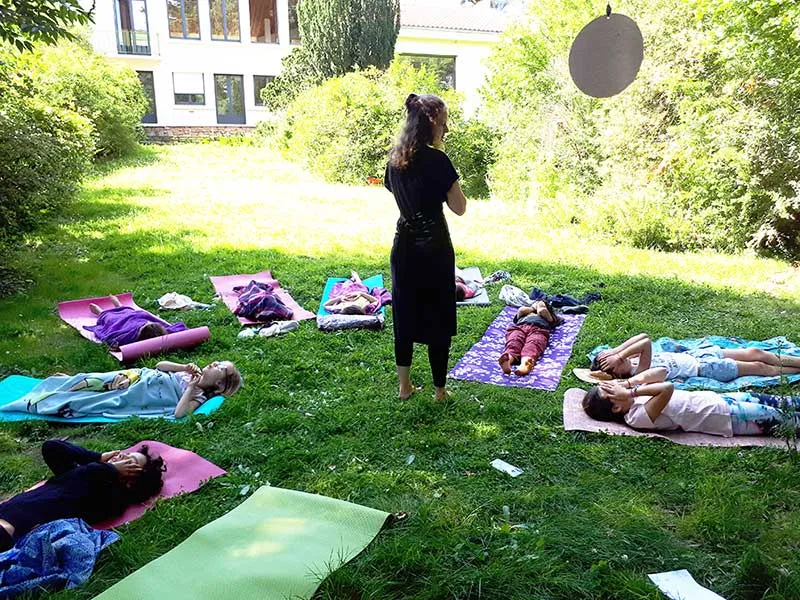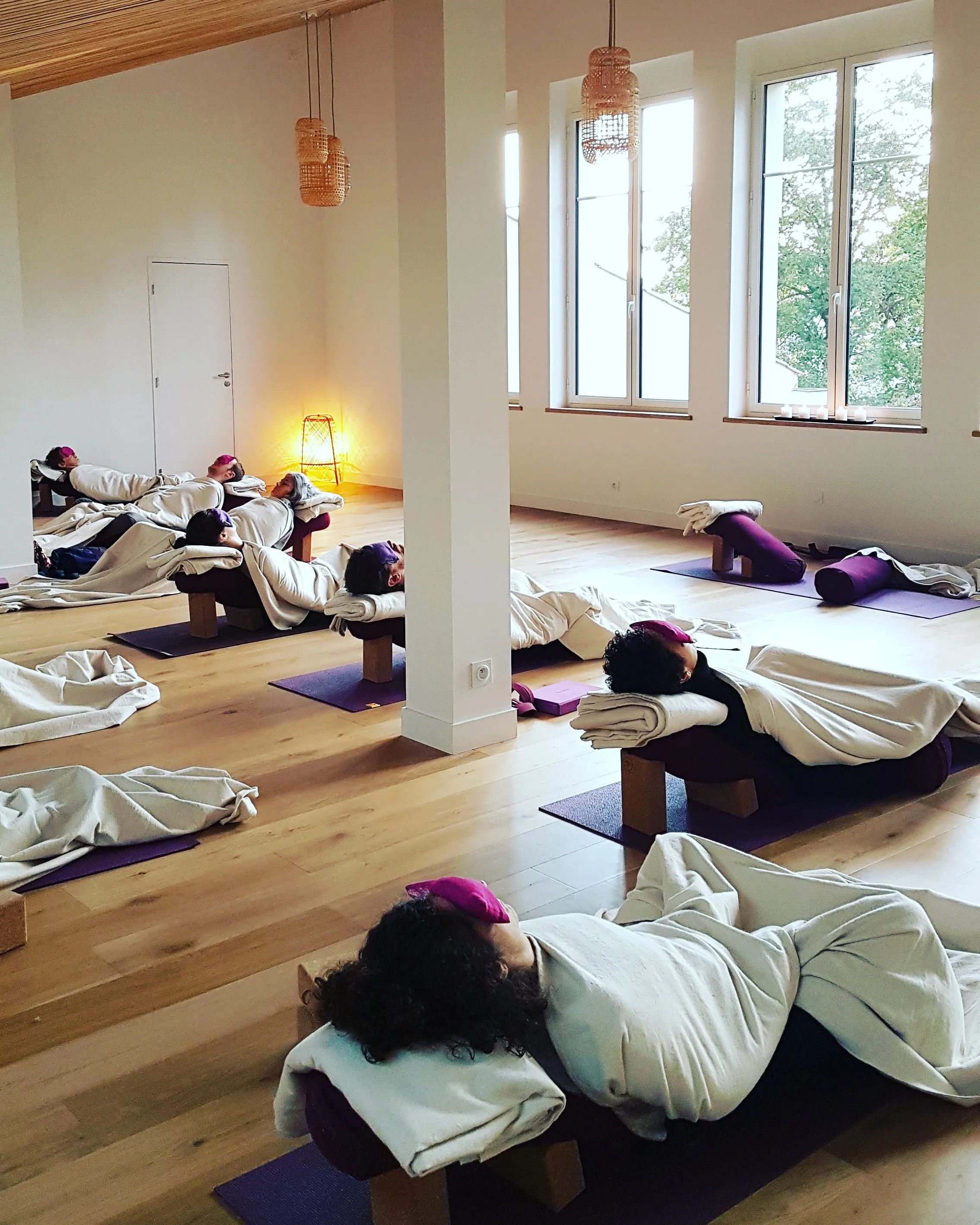 Le cours prend place dans une ambiance réconfortante et sécurisante : chaleur douce, ambiance tamisée, voix apaisante de l’enseigant(e), parfois quelques sons ou vibrations pourront aider l’esprit à s’apaiser.